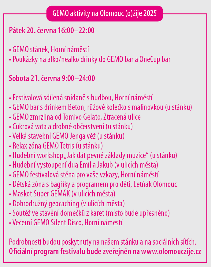 GEMO a.s. is proud to be the general partner for the 5th annual Olomouc (o)žije festival for the second time running. We’ve put together a fantastic programme with lots of perks for our employees. This festival is a brilliant chance to spend an unusual day out with your family, friends and colleagues.
