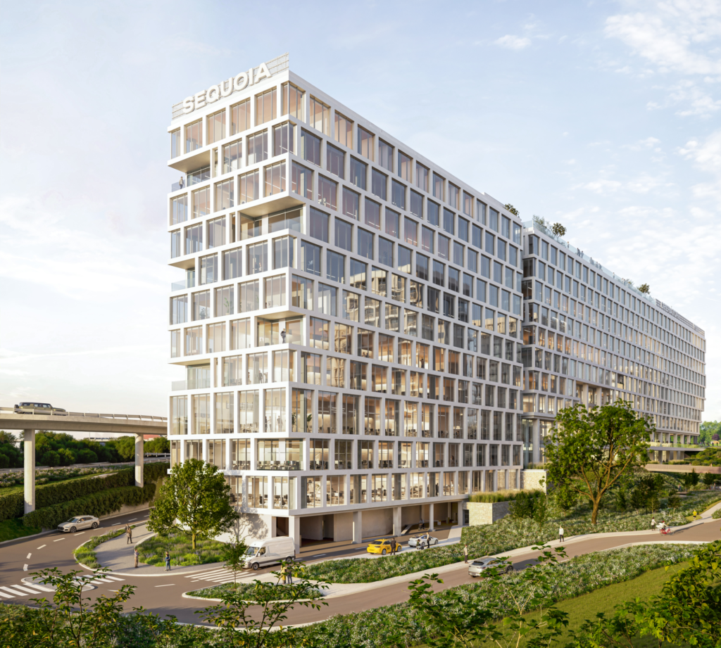 Sequoia follows the already completed Roztyly Plaza office building with ground‑floor services (fitness center, café, pharmacy, canteen, and more) and the four‑hectare revitalized Nové Roztyly Park, which is now a popular public space for sports and leisure (running track, workout areas, disc golf, outdoor fitness, parkour, and a children’s playground). Sequoia precedes the next planned phase of the Nové Roztyly revitalization — the Arboretum residential development — which will complement the office function with rental and owner‑occupied housing, contributing to the creation of a fully fledged urban district.