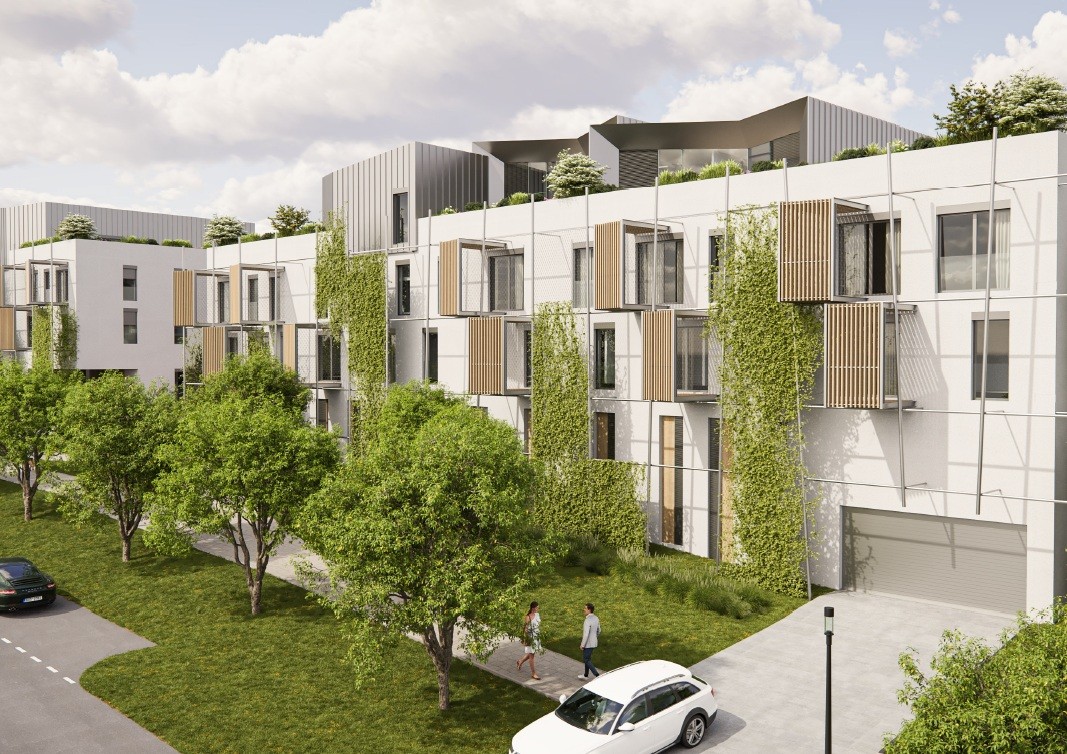 Bytové domy v severozápadní části města Olomouc – Neředín se skládají ze dvou obytných bloků o třech nadzemních podlažích s parkováním v suterénu, kde na části půdorysu ploché střechy jsou ve formě nástavby osazeny “rodinné” domy završené sedlovou střechou, kompletně opláštěné TiZn plechem s velkoplošnými skleněnými bezrámovými výplněmi.